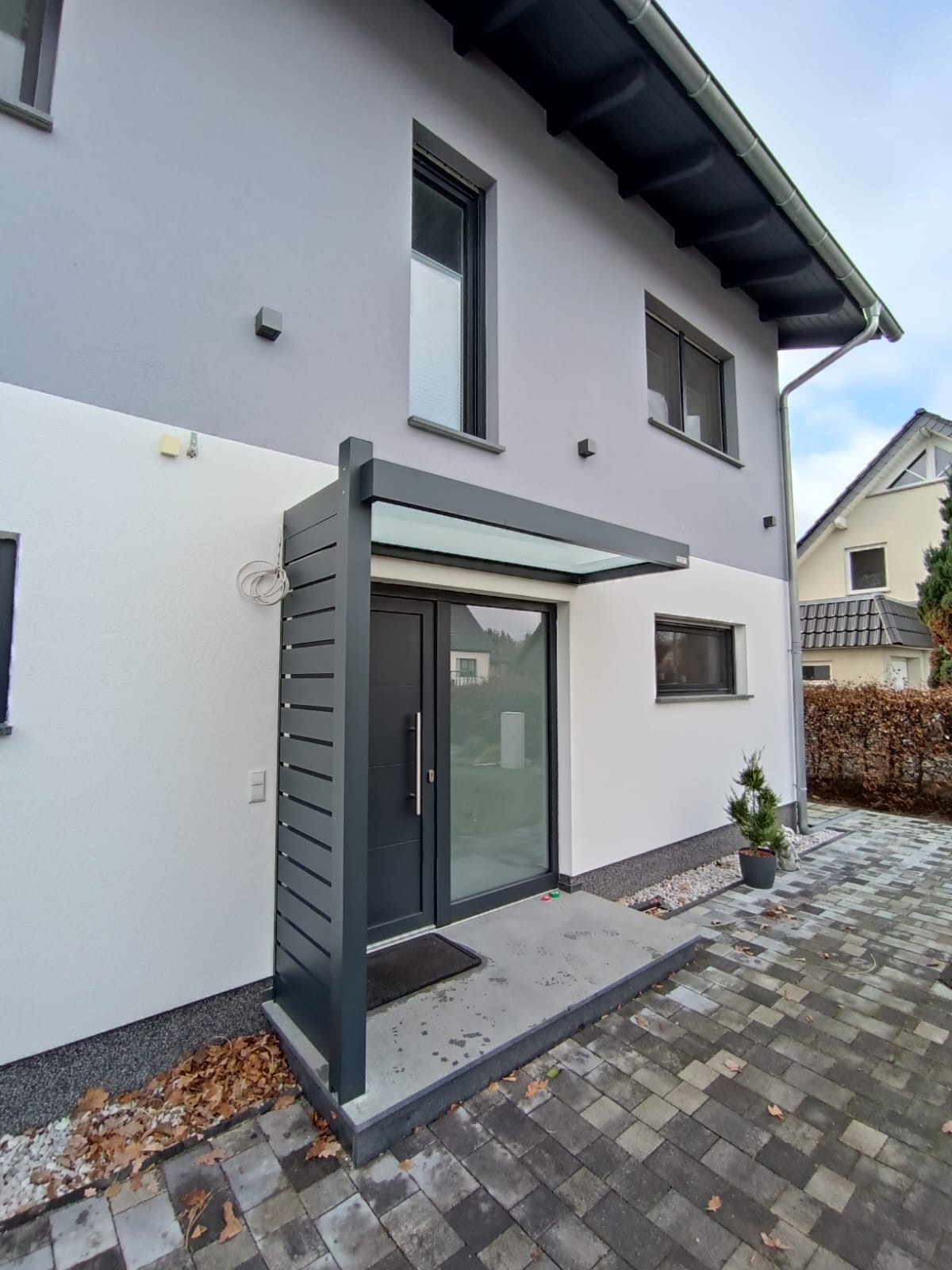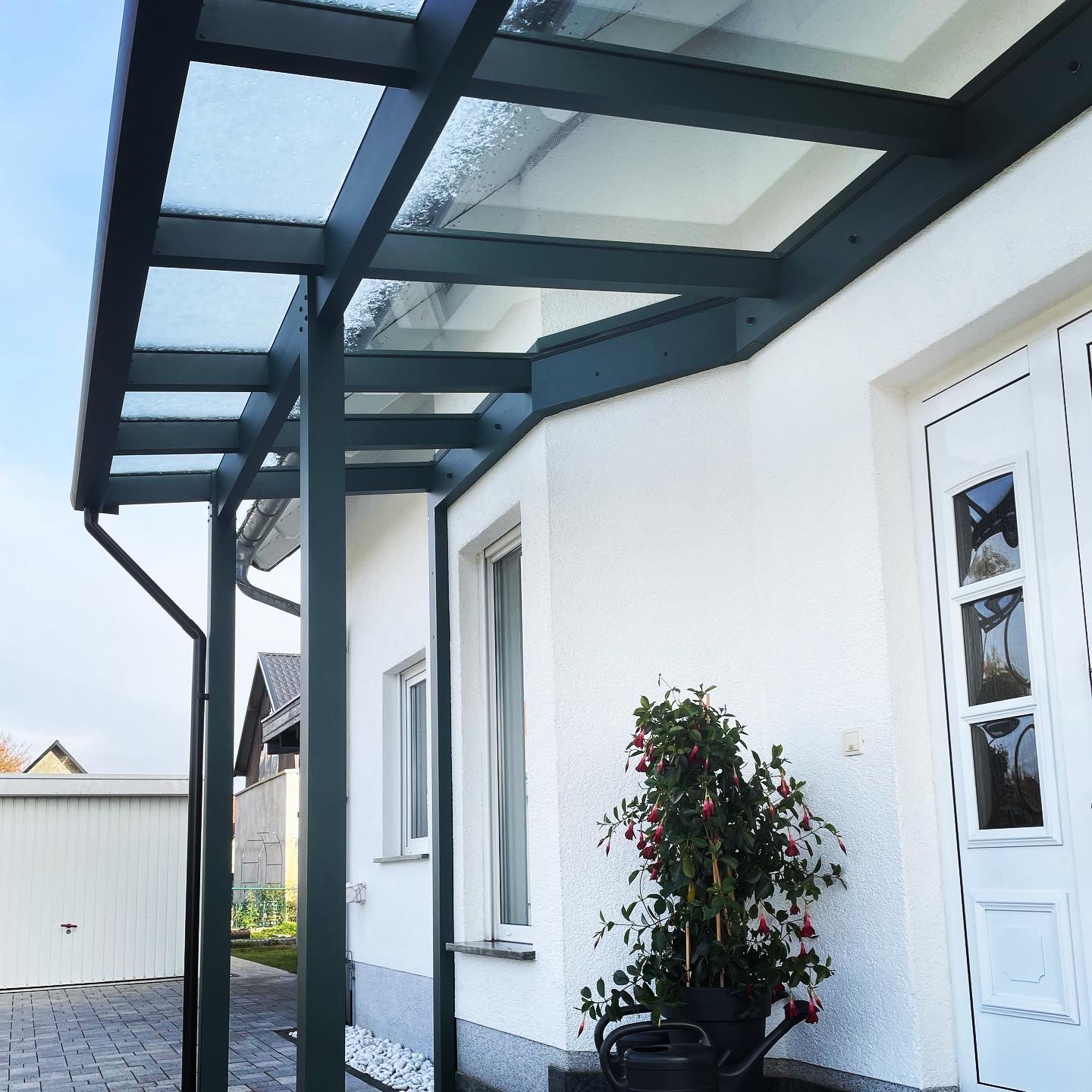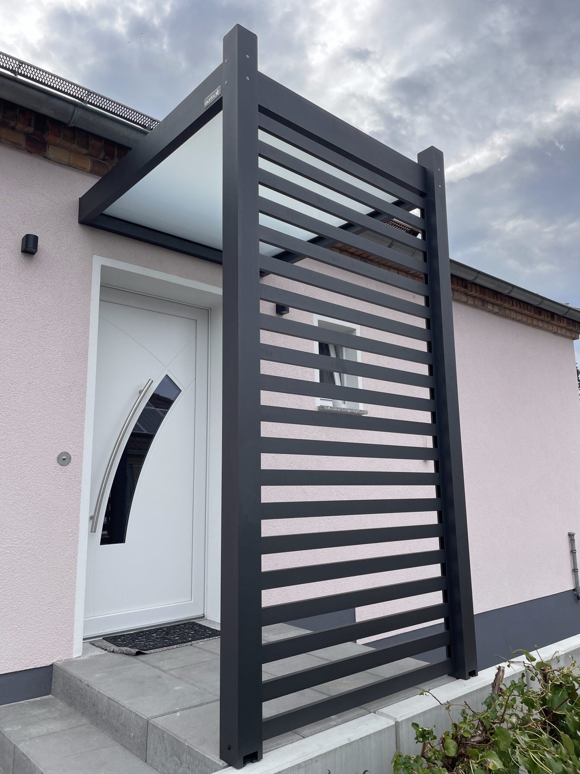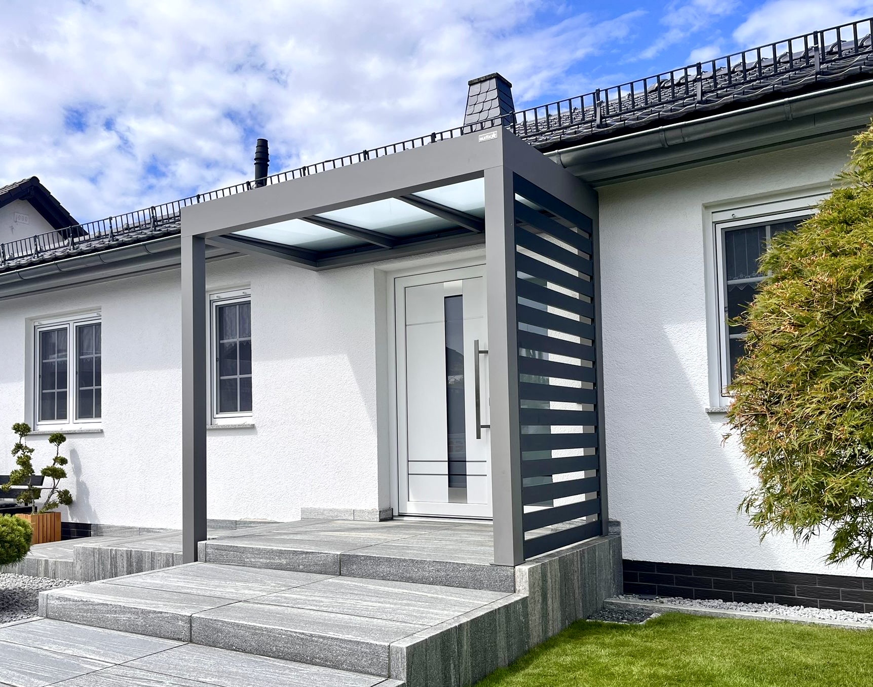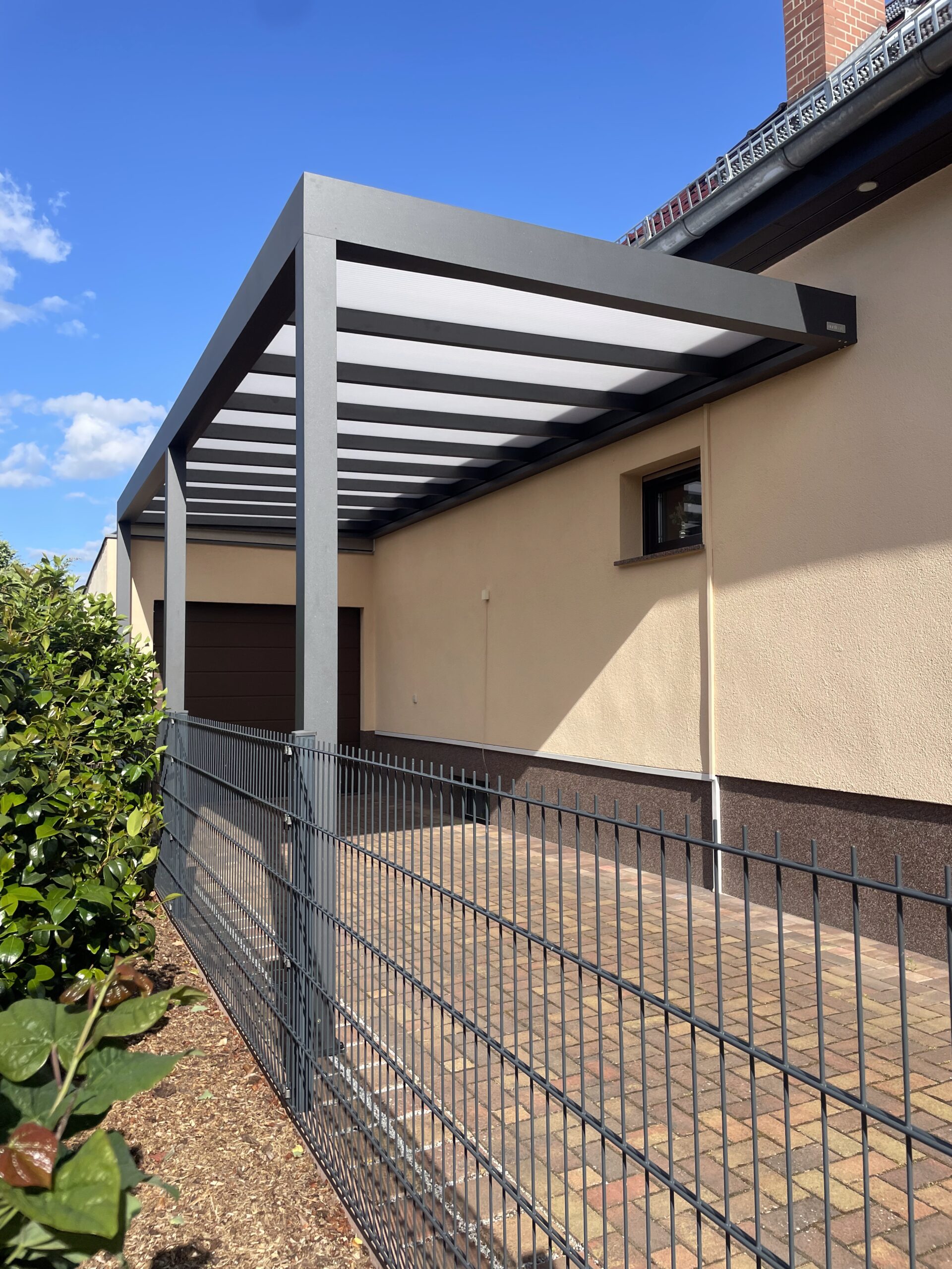 Die Konstruktionen fügen sich elegant in die Umgebung ein und verbinden Haus, Eingangsbereich und Stellplatz zu einem stimmigen Gesamtbild.