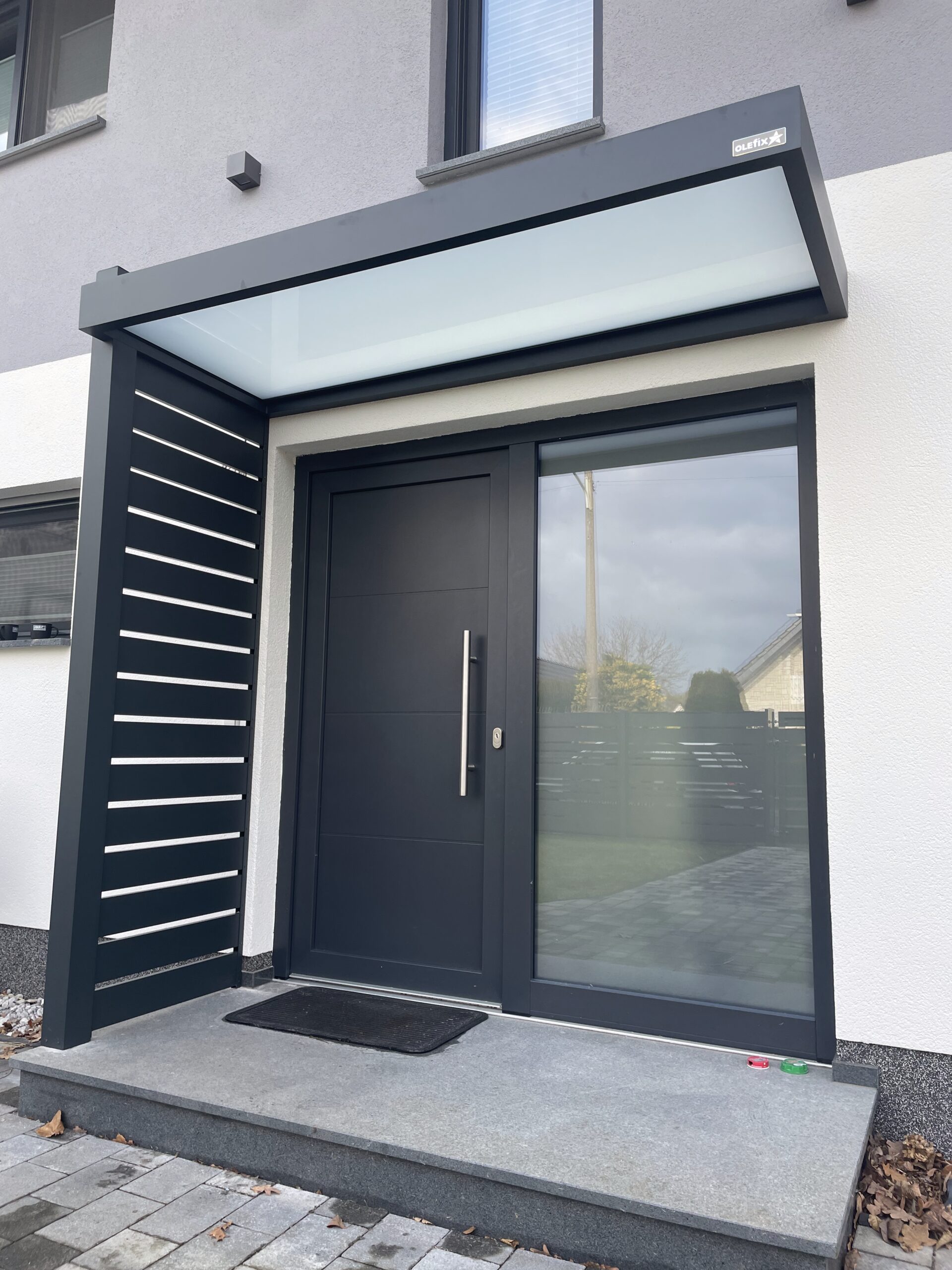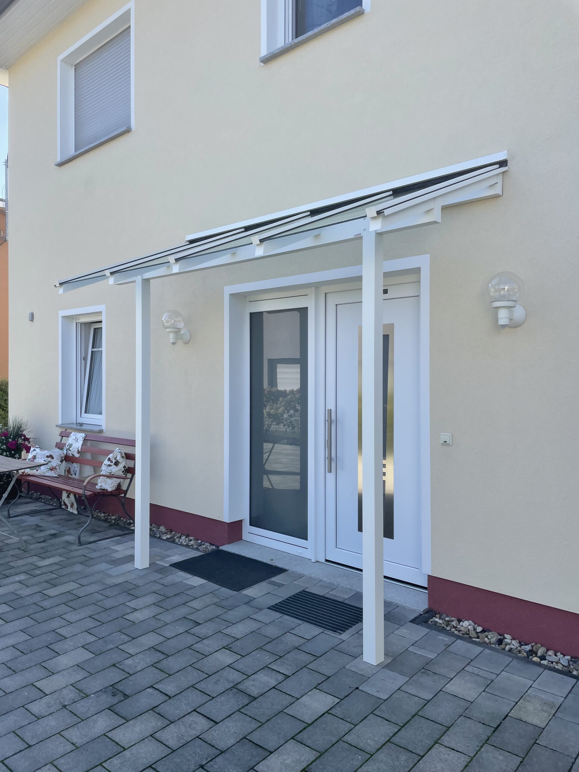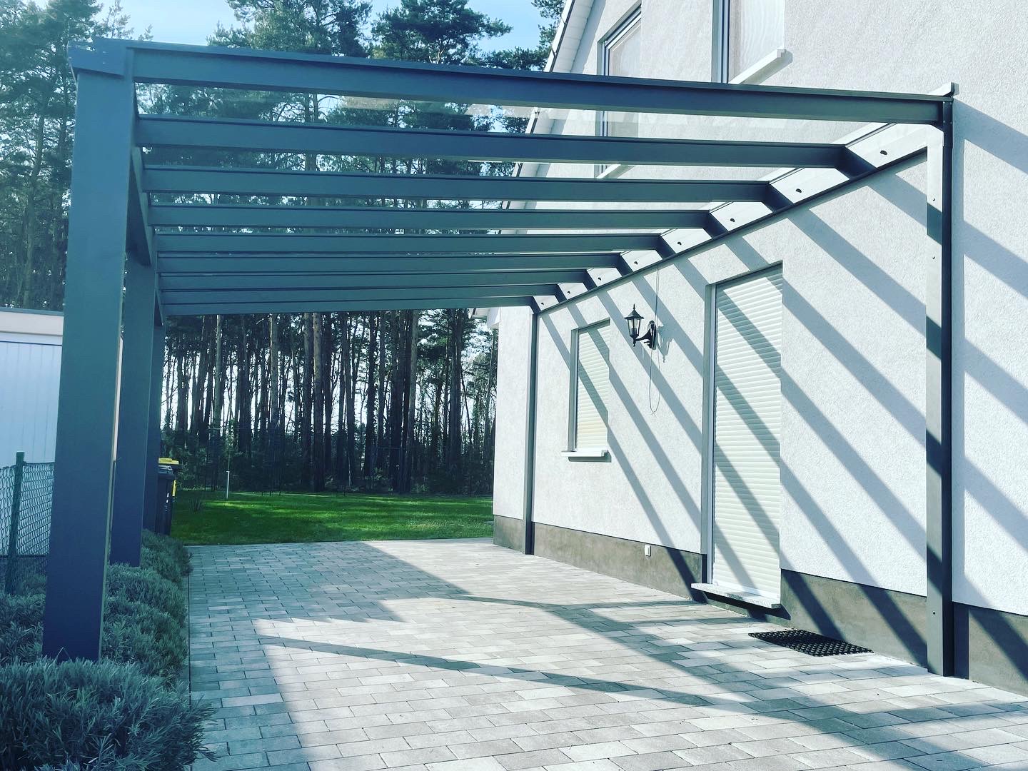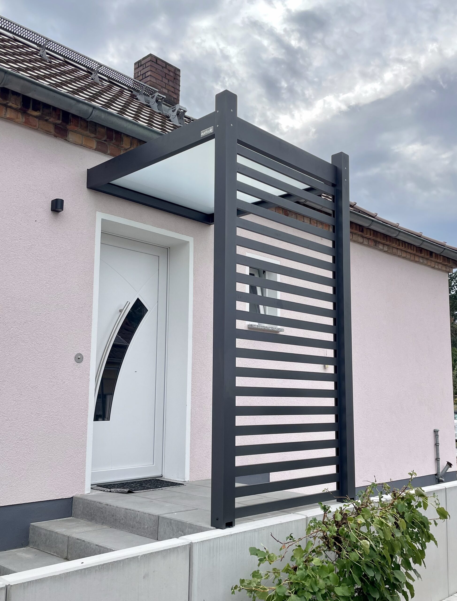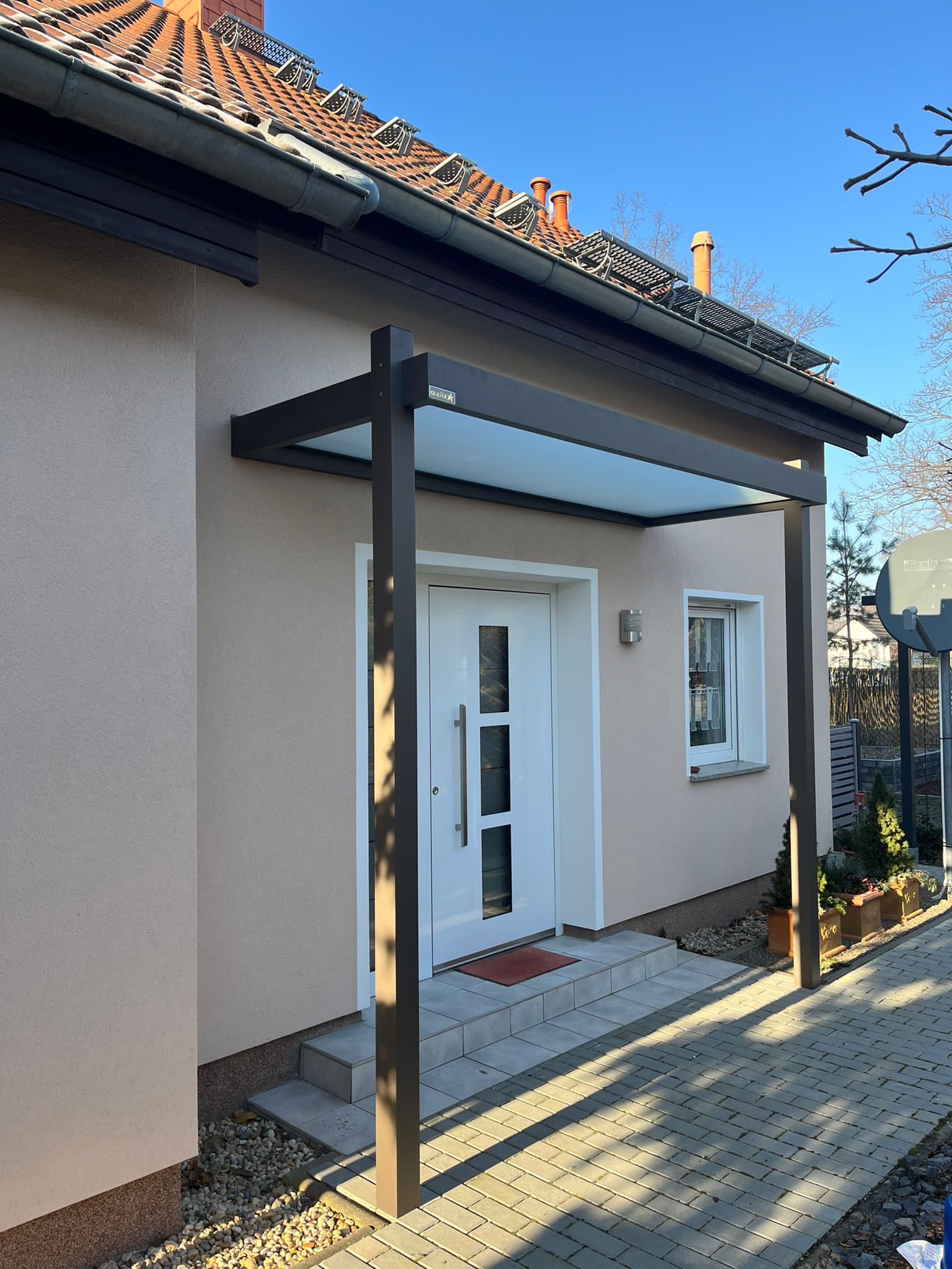 Die Konstruktionen fügen sich elegant in die Umgebung ein und verbinden Haus, Eingangsbereich und Stellplatz zu einem stimmigen Gesamtbild.