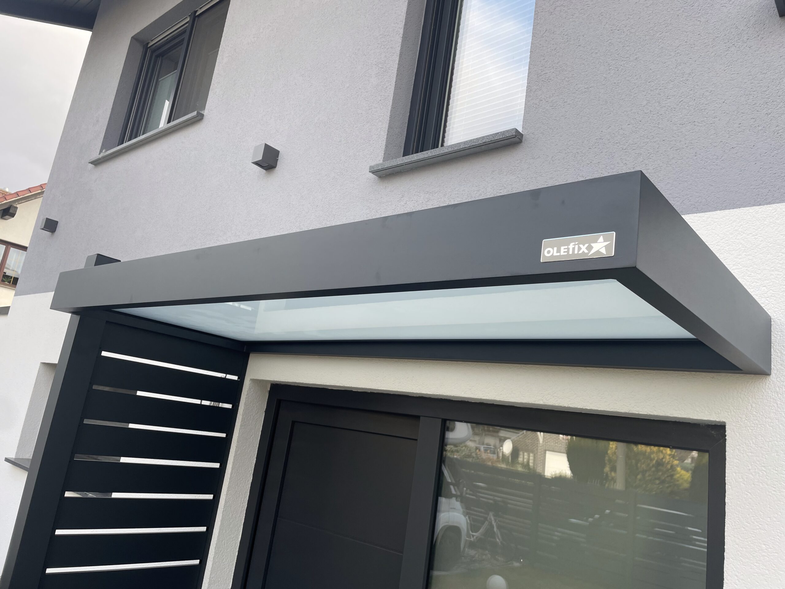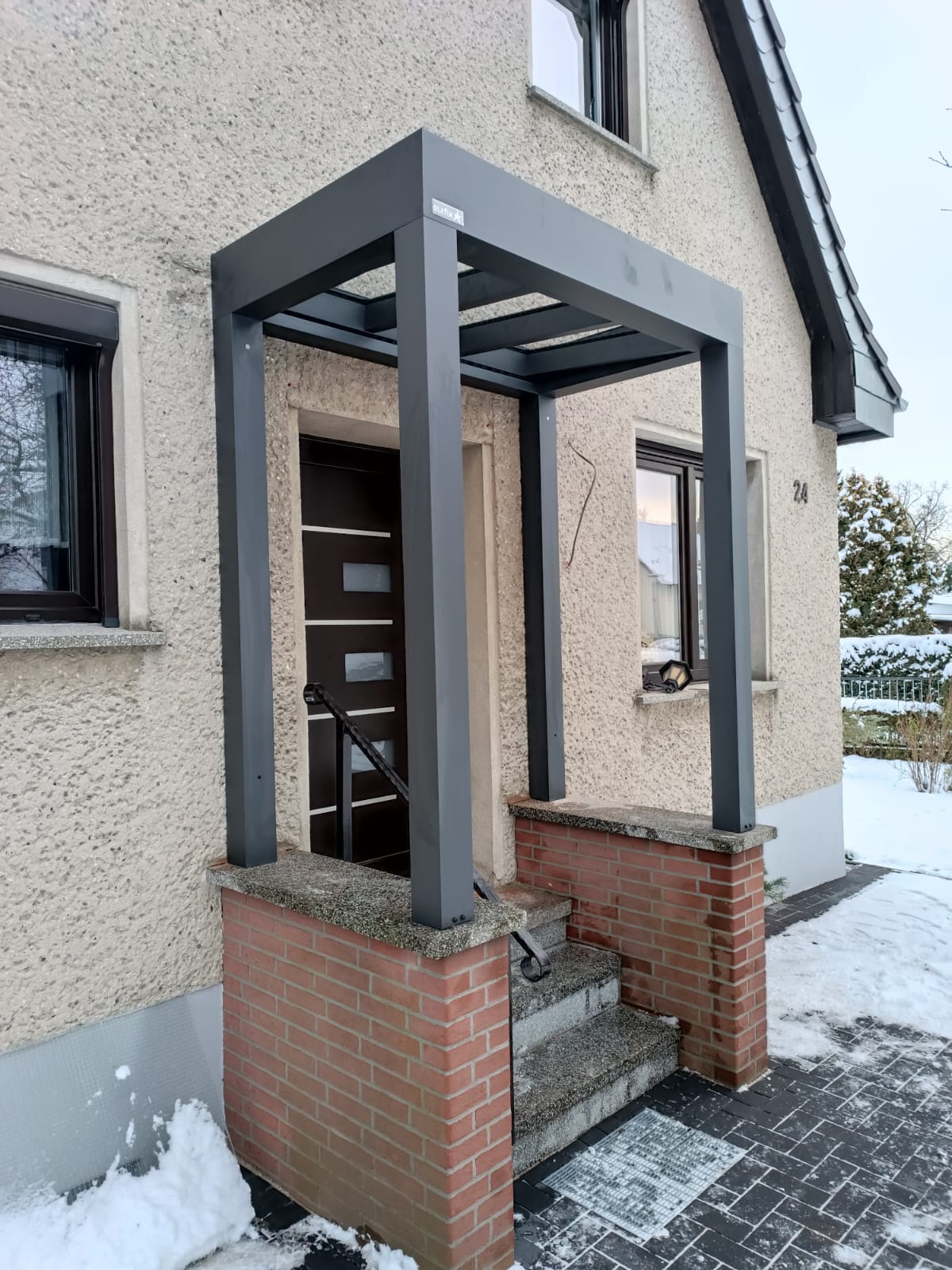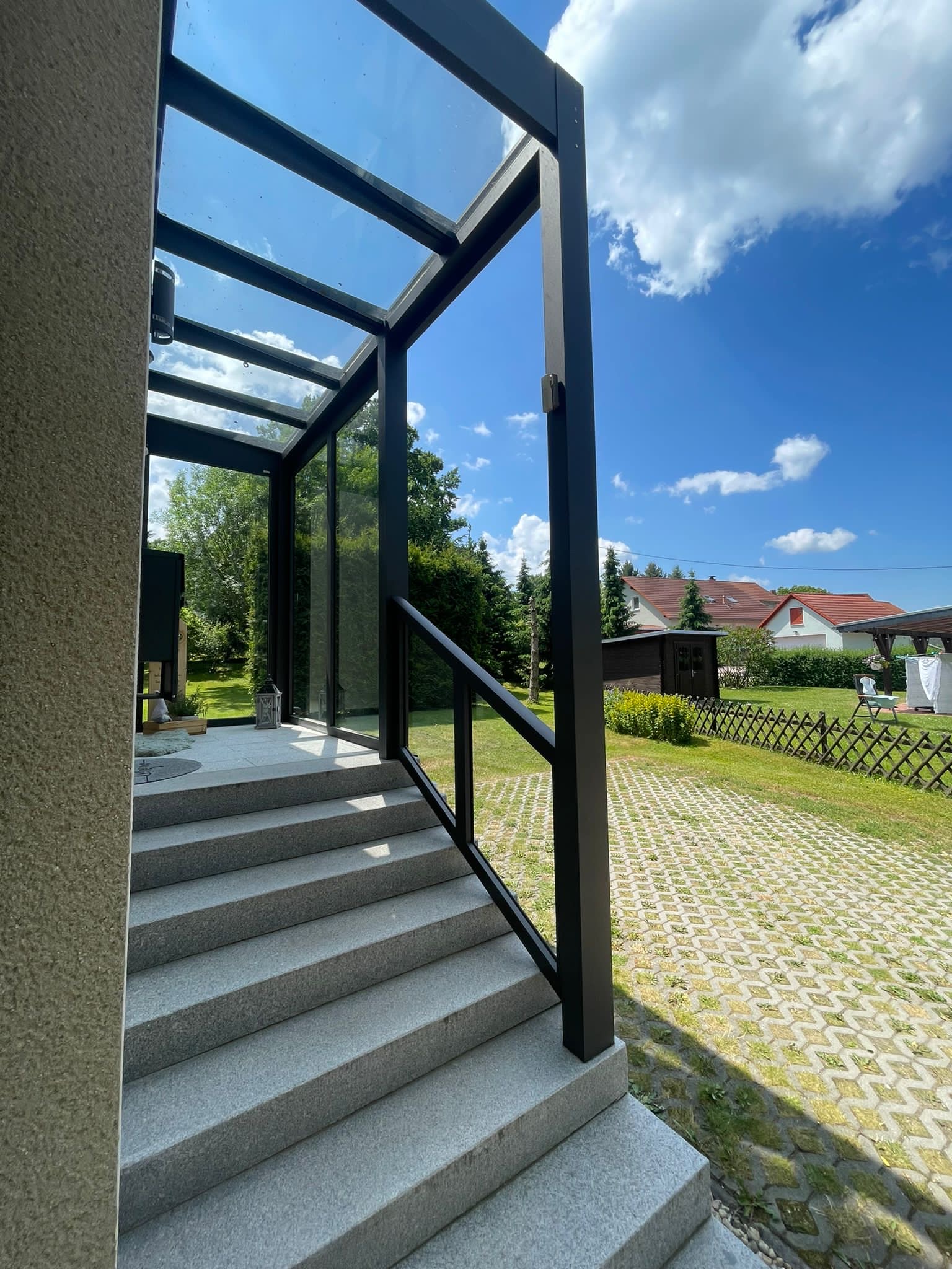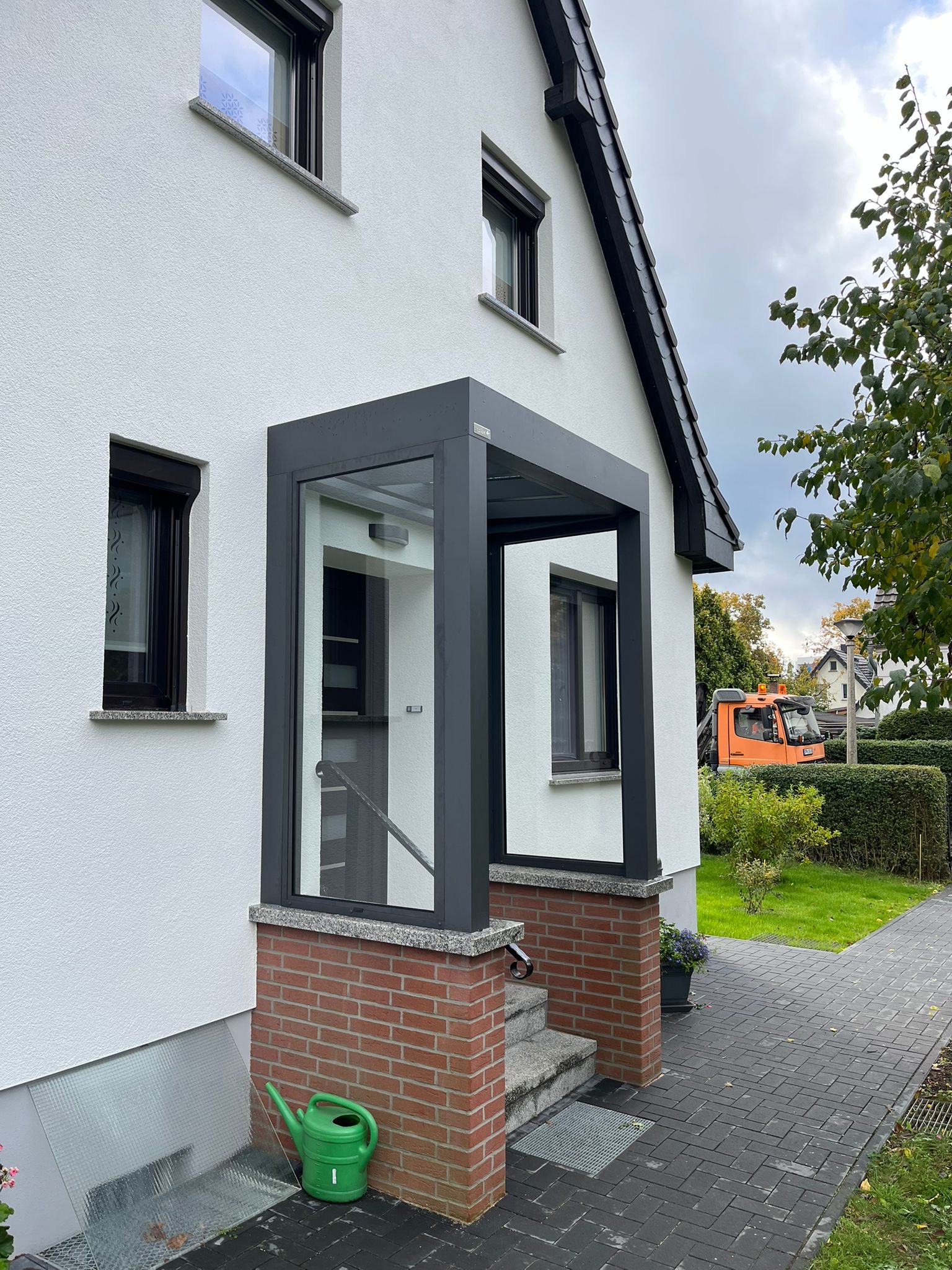 Die Konstruktionen fügen sich elegant in die Umgebung ein und verbinden Haus, Eingangsbereich und Stellplatz zu einem stimmigen Gesamtbild.