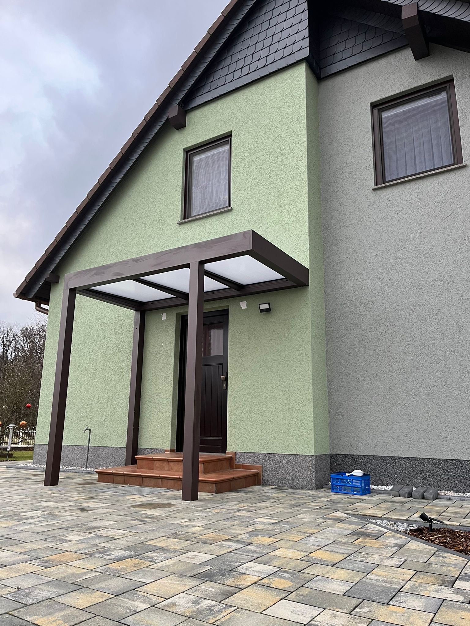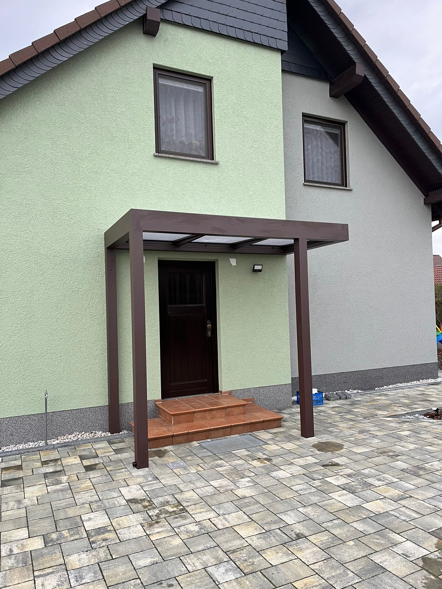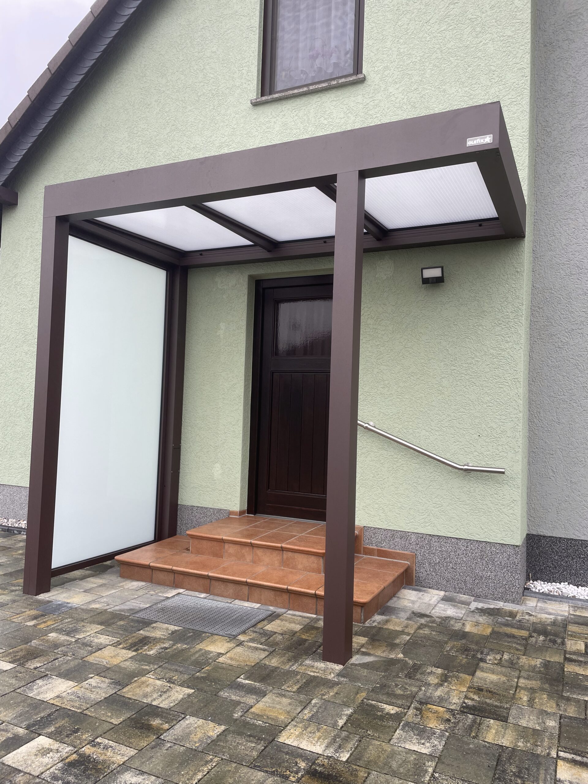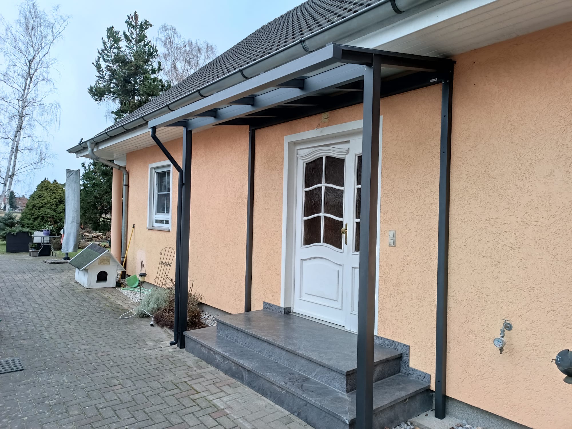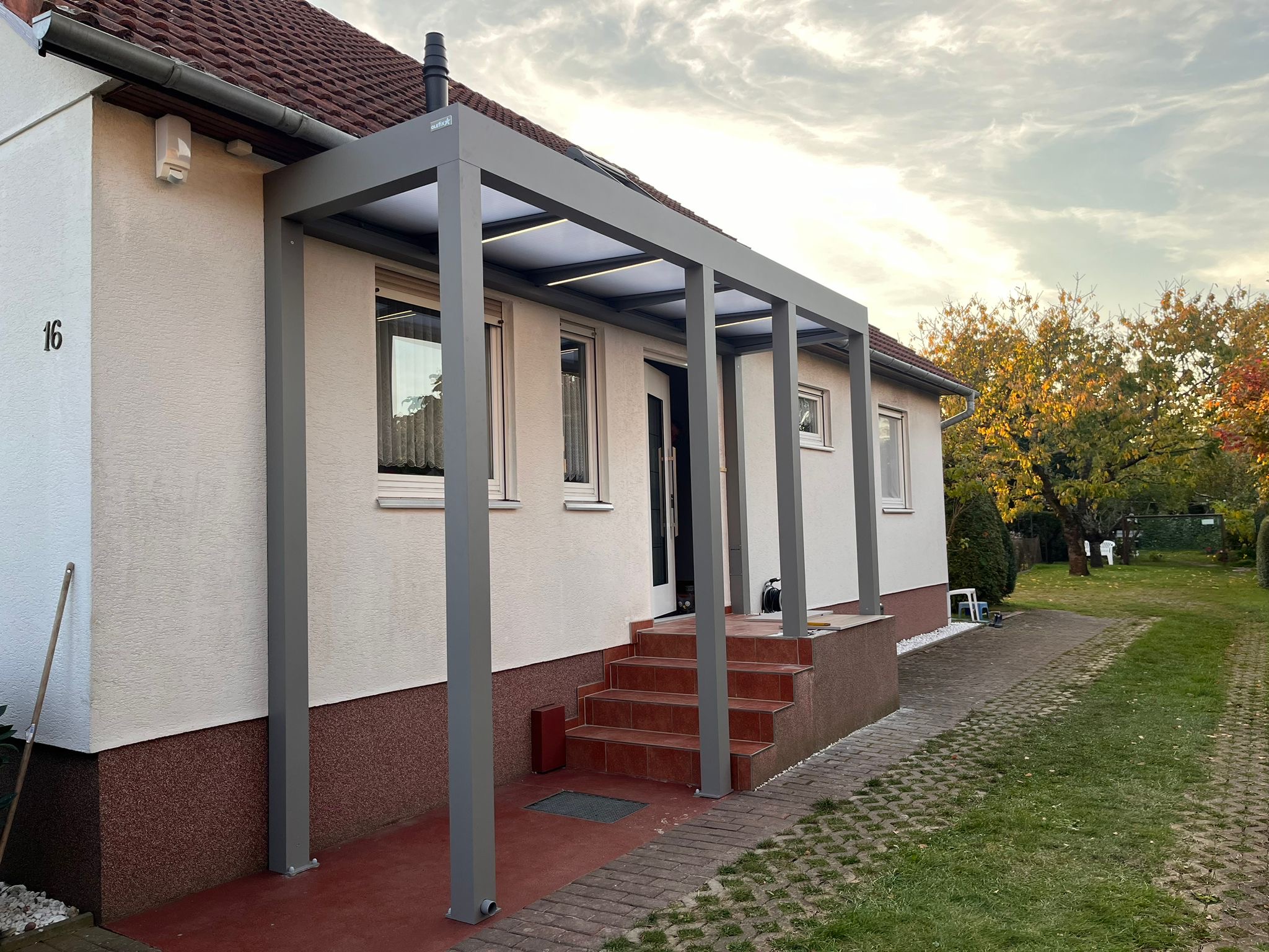 Die Konstruktionen fügen sich elegant in die Umgebung ein und verbinden Haus, Eingangsbereich und Stellplatz zu einem stimmigen Gesamtbild.