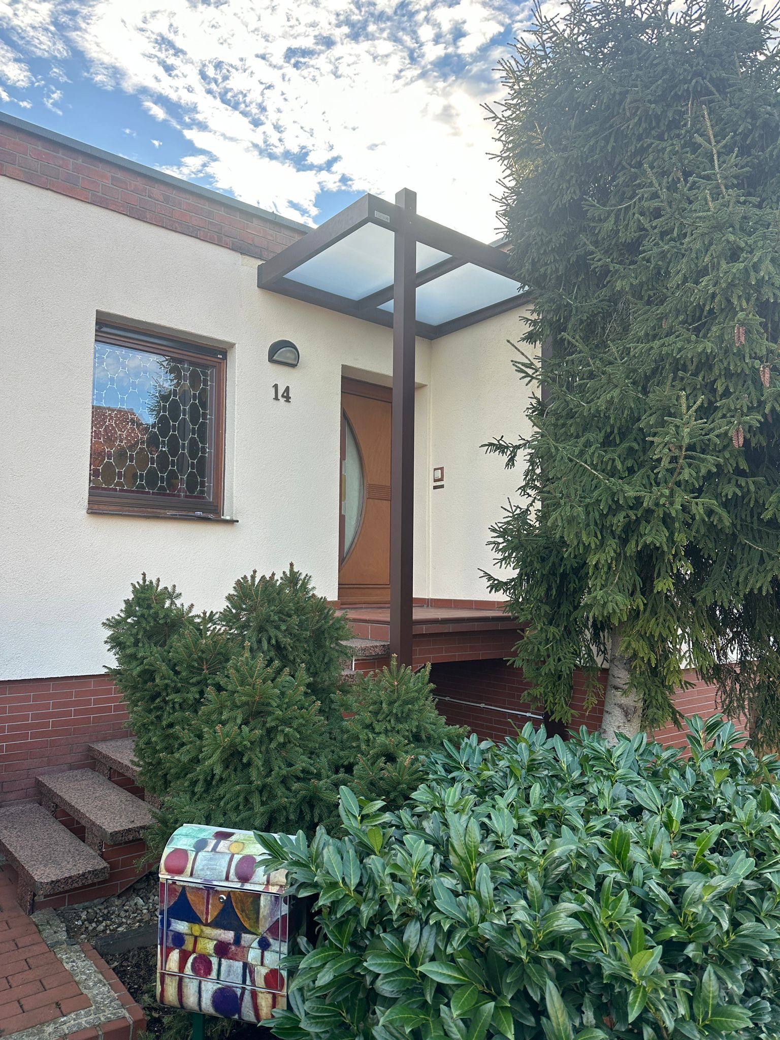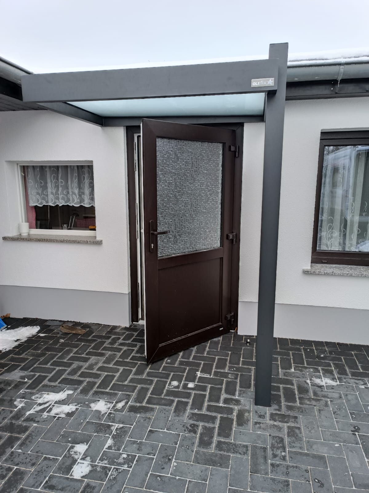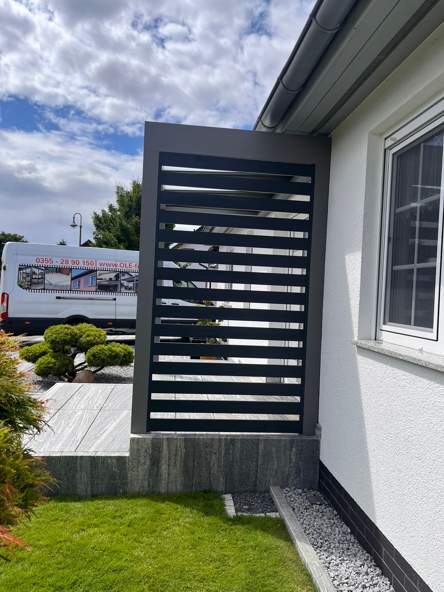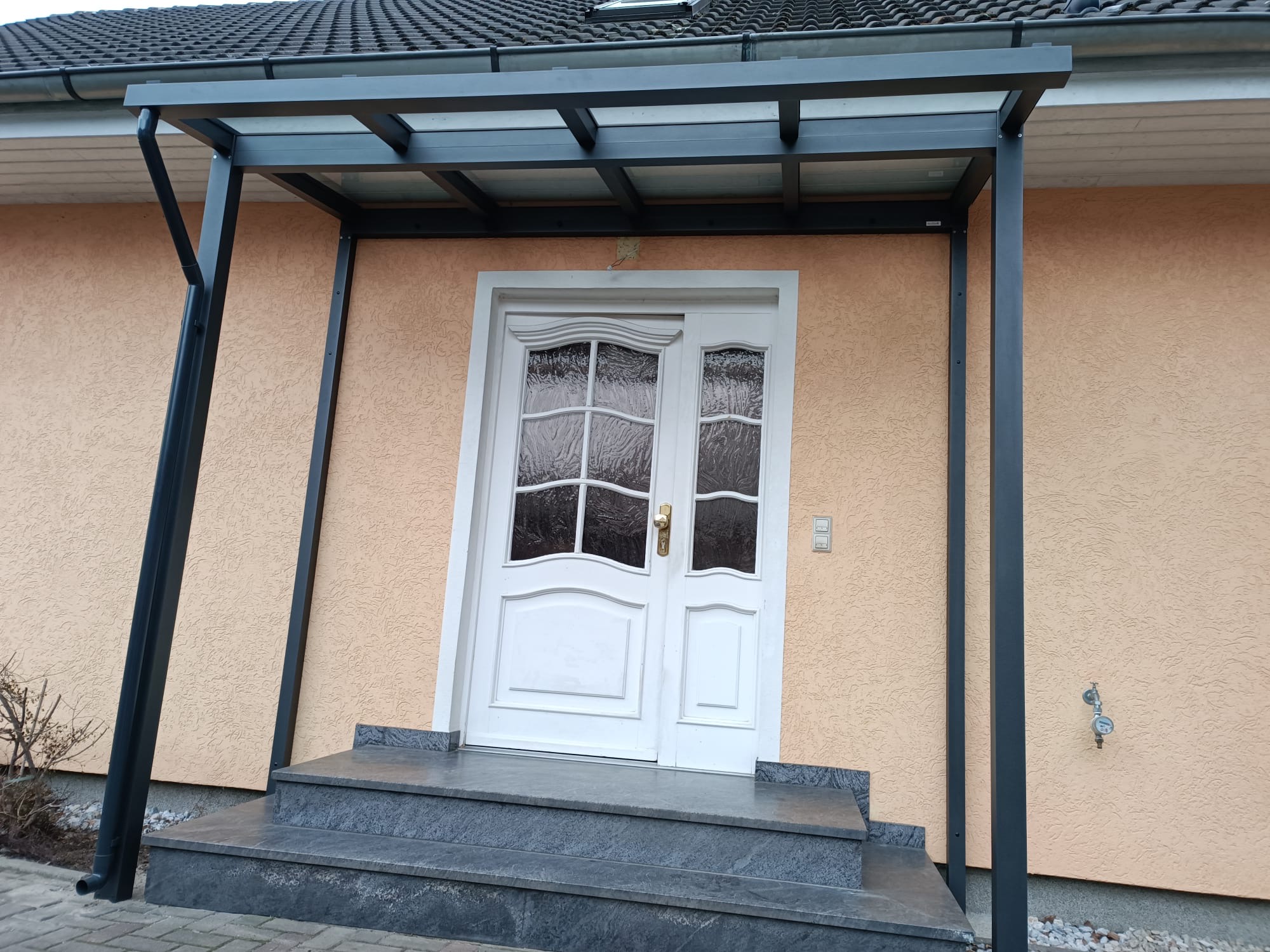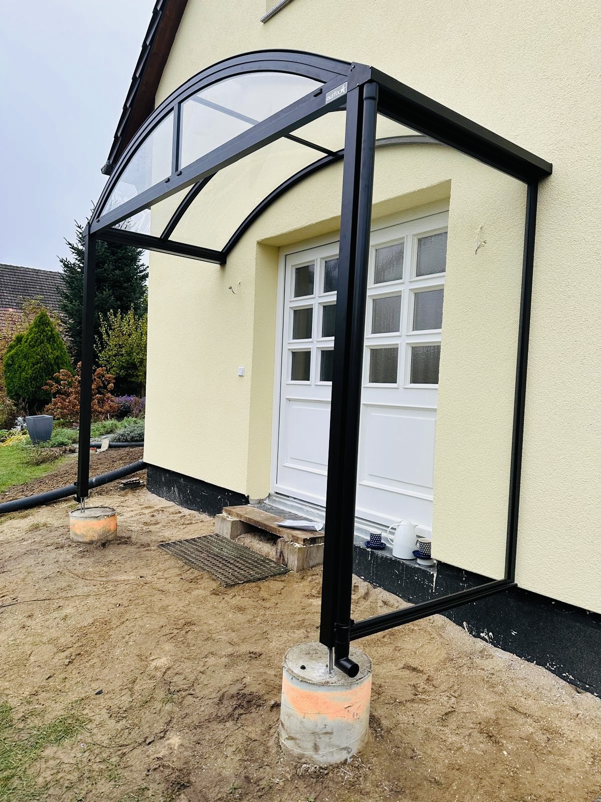 Die Konstruktionen fügen sich elegant in die Umgebung ein und verbinden Haus, Eingangsbereich und Stellplatz zu einem stimmigen Gesamtbild.